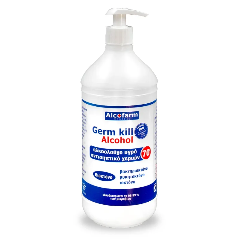 Το Germ Kill Alcohol είναι προϊόν Ελληνικής παραγωγής, για την ταχεία αντισηψία χεριών σε υγρή μορφή. Δεν χρειάζεται σαπούνι και νερό. Είναι αποτελεσματικό και ασφαλές για χρήση σε όλους τους χώρους, καθώς προφυλάσσει την εξάπλωση των ασθενειών, μέσω των χεριών. Είναι έτοιμο προς χρήση.